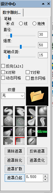 是一副灰度图像。当笔刷作用于模型时,纹理图像的印记会反映在模型上。经常与拖拽笔触配合,在模型上雕刻复杂的纹理图案。