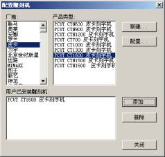 2.设备设置:单击“刻绘设备”按钮,根据所购买的刻字机型号在厂商列表中选择设备类型,单击“添加”按钮,在“用户以安装的刻字机”中就会出现此型号的刻字机。